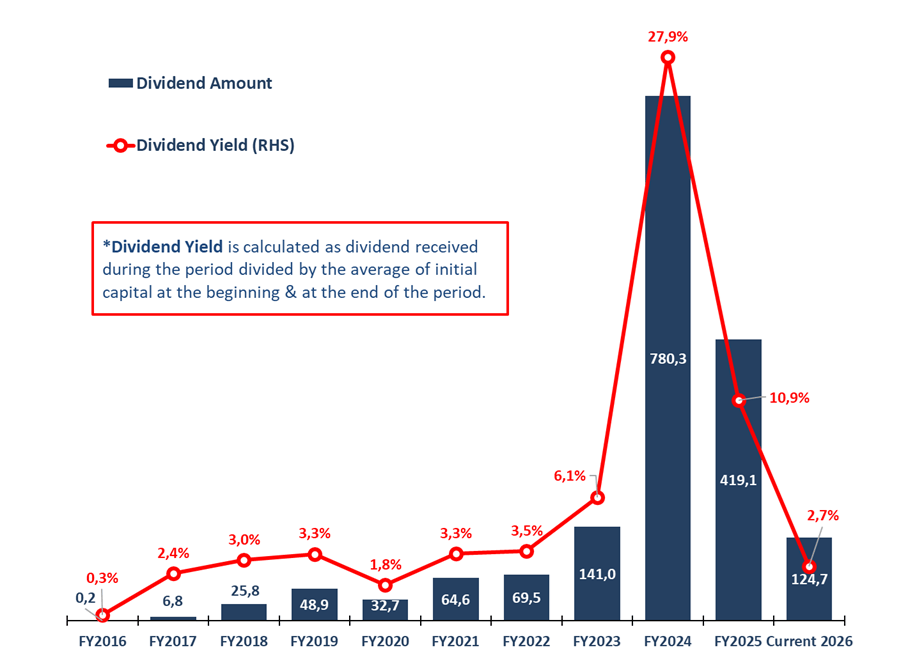 F. Historical Dividend Received (Annually, IDR Millions) & Dividend Yield (%)