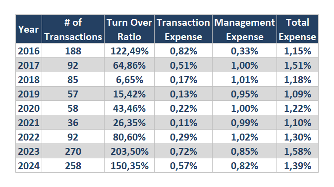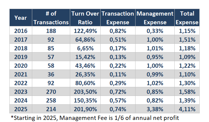 Performance fee is 1/6 of annual profit (0 if annual loss).