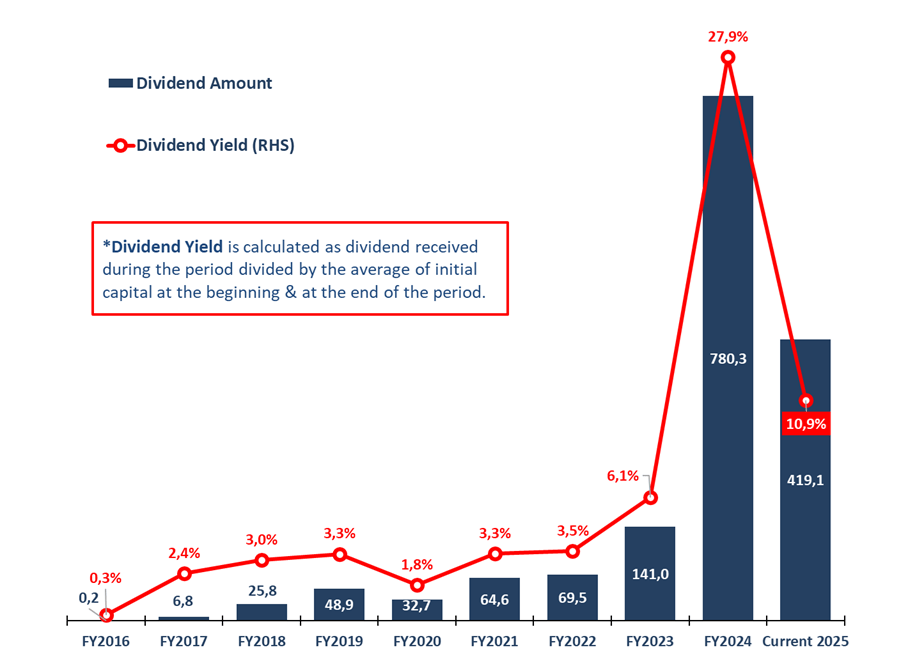 F. Historical Dividend Received (Annually, IDR Millions) & Dividend Yield (%)